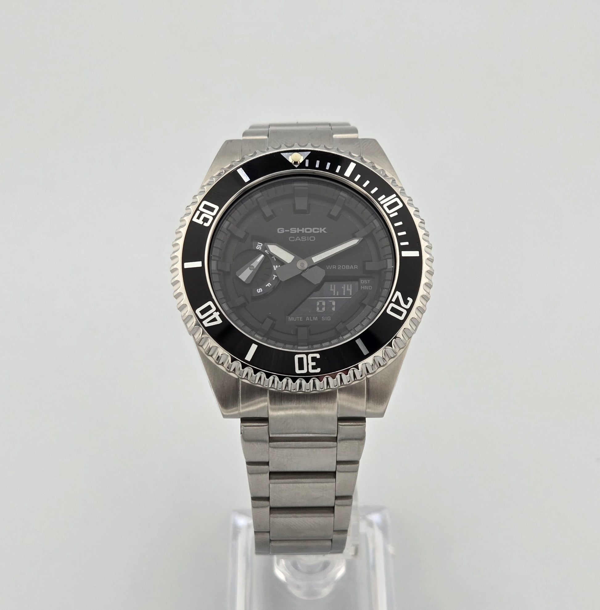 Original Casio G-Shock GA 2100 customized by hand at CT Watches in Toronto, ON with full stainless steel case and strap. Perfect watch for those looking for the classic dive watch look with proven G-Shock movement.
